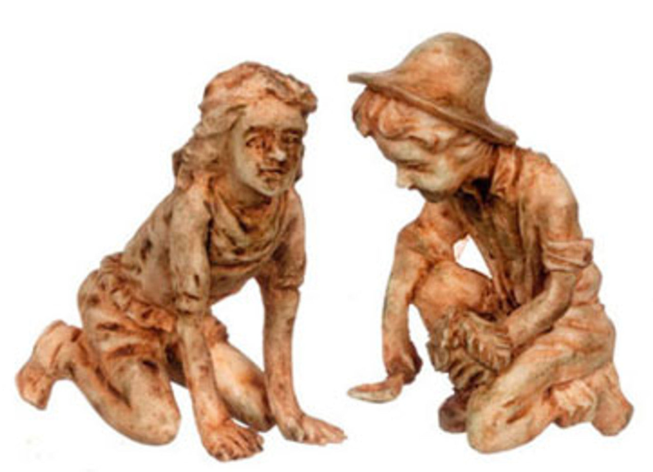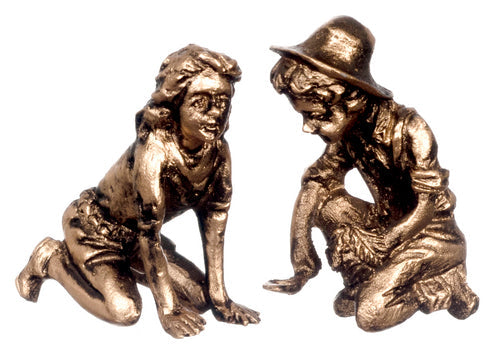 This is a set of statues in gold finish of a boy and girl gardening for your dollhouse.